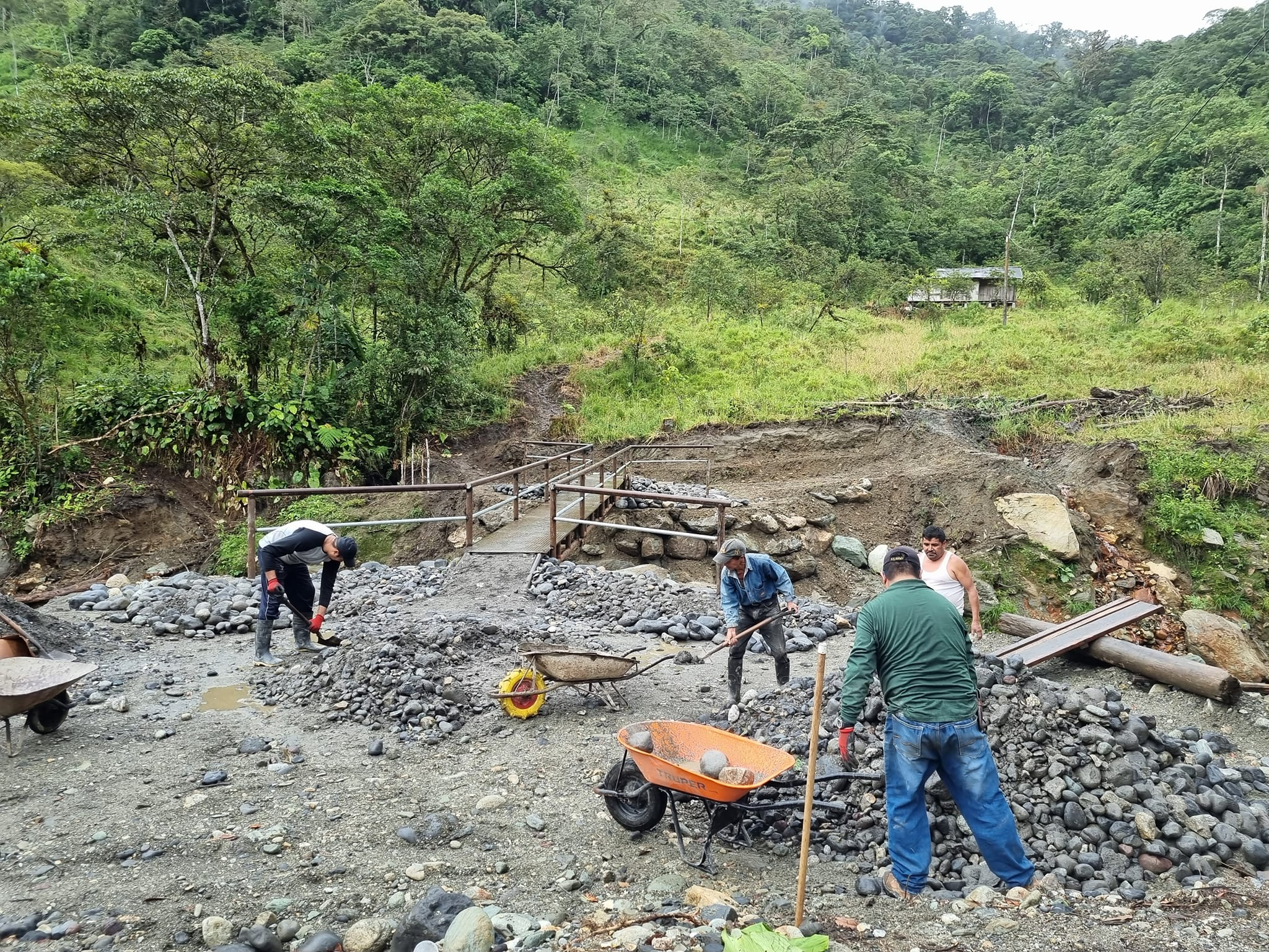Moradores del Sector Las Estancias en coordinación con el Gobierno Parroquial de Río Negro, realizan trabajos de minga en la construcción del puente Peatonal. Informa. Edgar Zabala Jaramillo, Presidente del GADPRN.